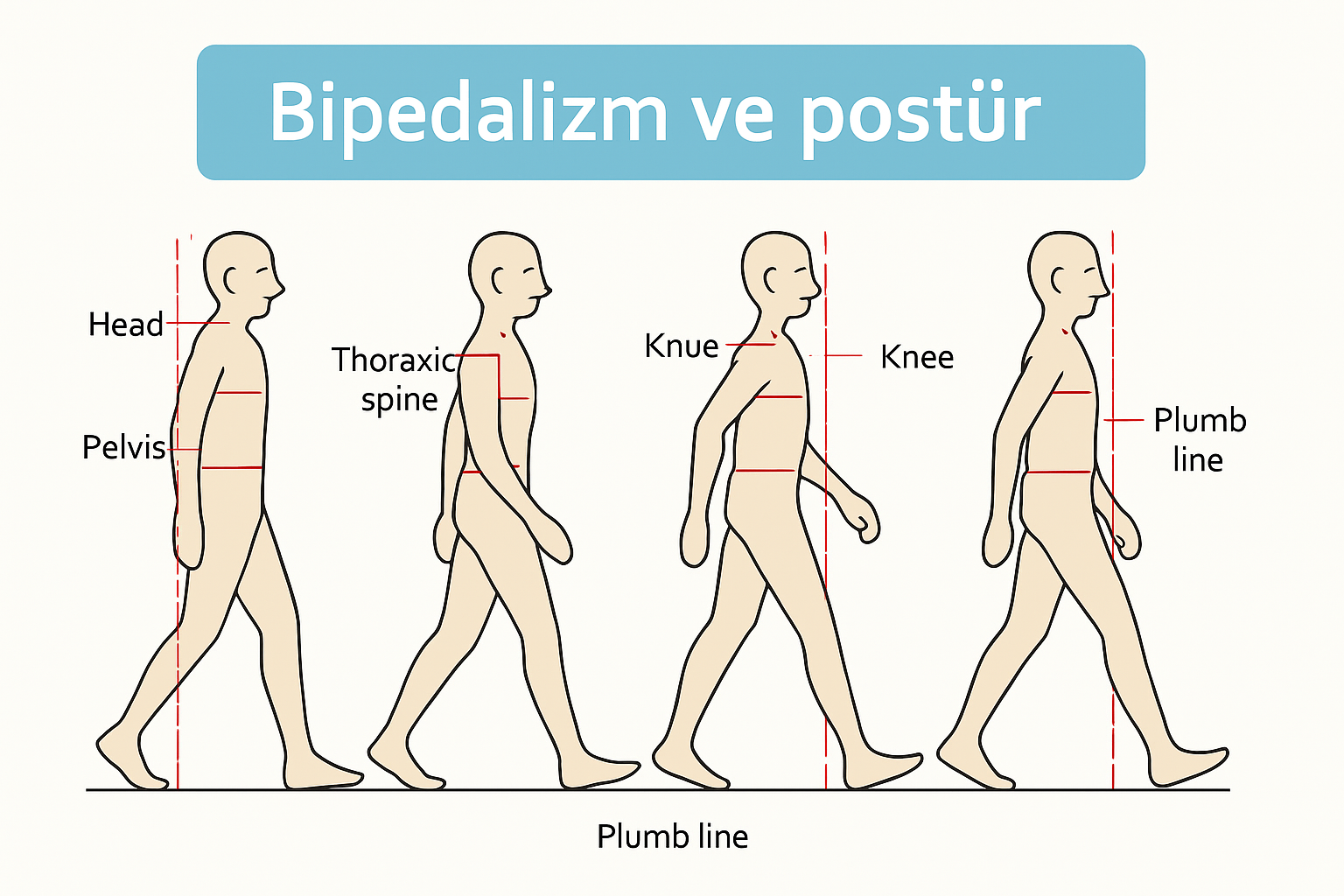 Bu görsel, bipedalizm ve postür ilişkisini daha net anlamak için iki temel noktayı özetler: yürüyüş döngüsünde vücut ağırlığının dengeli dağılımı ve dikey hizalanma prensibi. İnsan evriminde iki ayaklılığın kazanımı; omurga, pelvis ve alt ekstremite adaptasyonlarıyla birleştiğinde modern duruşun temelini oluşturmuştur. Ancak yanlış postür alışkanlıkları (öne eğik baş, yuvarlak omuz, pelvik tilt) bu dengeyi bozabilir. Doğru hizalanmayı korumak için düzenli fonksiyonel testler ve duruş egzersizleri kritik öneme sahiptir.